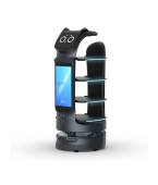 Робот оснащен интерактивным дисплеем, который позволяет ему общаться с клиентами, отображая различные эмоции и настраиваемые голосовые сообщения. Это создает дружелюбную атмосферу и улучшает взаимодействие с гостями.