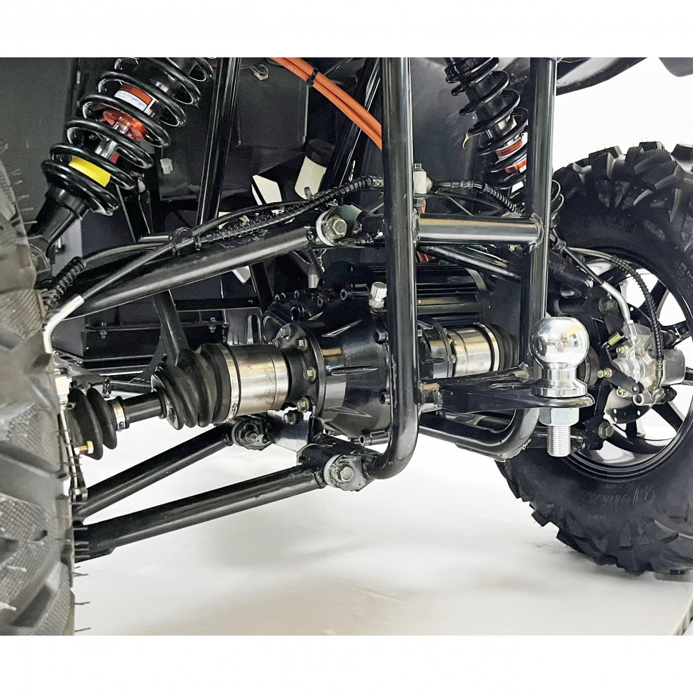Шасси электроквадроцикла оснащено дифференциальной передачей и регулируемыми амортизаторами, что обеспечивает отличную управляемость и комфортную езду. Дисковые гидравлические тормоза на передних и задних колесах гарантируют надежное торможение, что повышает безопасность при движении по сложным маршрутам.