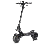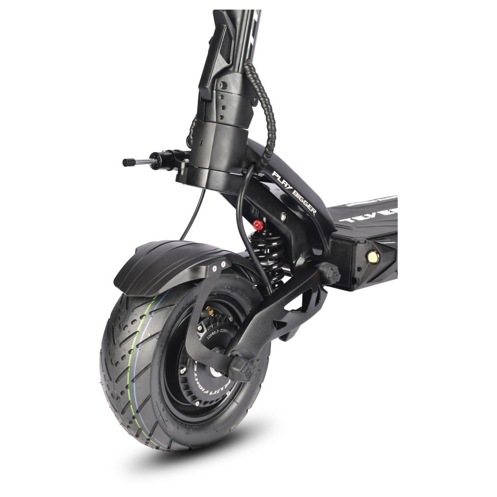 Стильная и надежная рама из высокопрочного авиационного алюминия обладает феноменальной грузоподъемностью до 120кг при общем весе самоката в 36 кг. А за комфортное преодоление неровностей отвечают два масляных амортизатора KKE размером 180мм. Они обладают внушительным ходом, а так же имеют функцию блокировки для городского использования. Для переноски самоката предусмотрен зацеп и удобный механизм складывания.