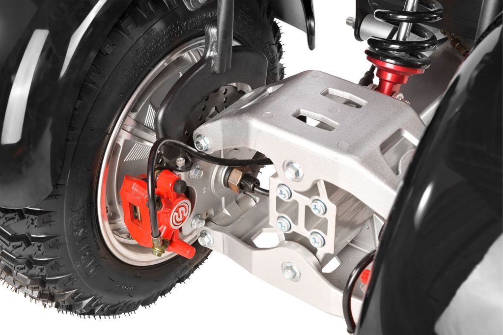 Тормоза на гидравлике и регулируемая подвеска позволяют ехать в горку под углом до 30 градусов, но предпочтительнее это делать на асфальтированном полотне. Грузоподъемность 200 кг и скромный вес трицикла в 103 кг позволяют использовать ТС для гонок. Задние ведущие колеса, оснащенные протекторами с грунтозацепами, и независимая подвеска обеспечивают электроциклу устойчивость – вероятность того, что ТС уйдет в лоусайд на опасной трассе при входе в вираж 40-45 градусов стремится к нулю. Усиленные дисковые тормоза при движении гарантируют повышенную защищенность водителя и пассажиров.