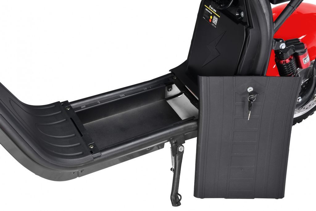 Дополнительно, в скутере предусмотрен бокс для хранения, выполненный из прочного пластика и способный выдерживать нагрузку до 30 кг. Это позволяет брать с собой необходимые вещи, не беспокоясь о том, что они могут повредиться или потеряться во время поездки.