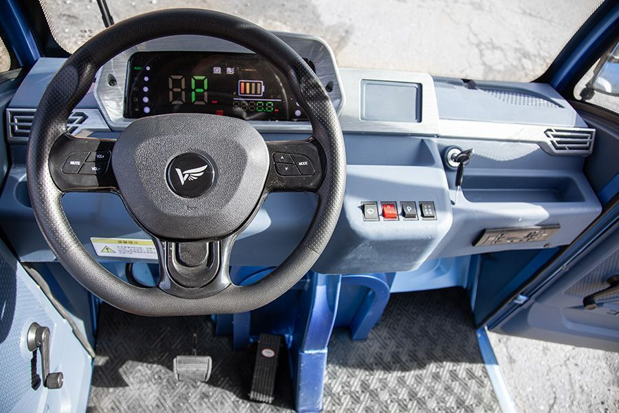Электрический трицикл Rutrike Фактор 2600 предлагает высокий уровень комфорта для водителя. Кабина оборудована рулевым колесом, что упрощает управление по сравнению с мотоциклетными рулями, используемыми в меньших моделях. Это делает поездки более удобными, особенно при длительном использовании.