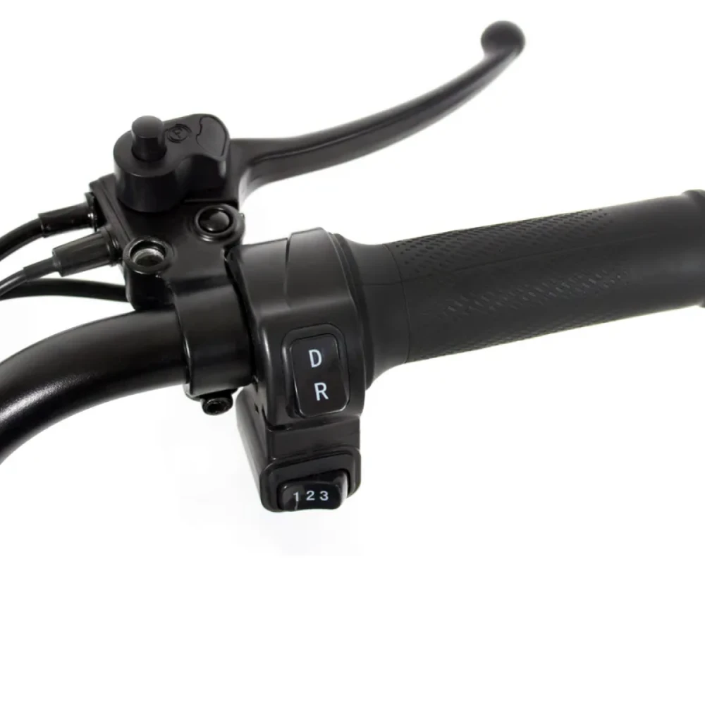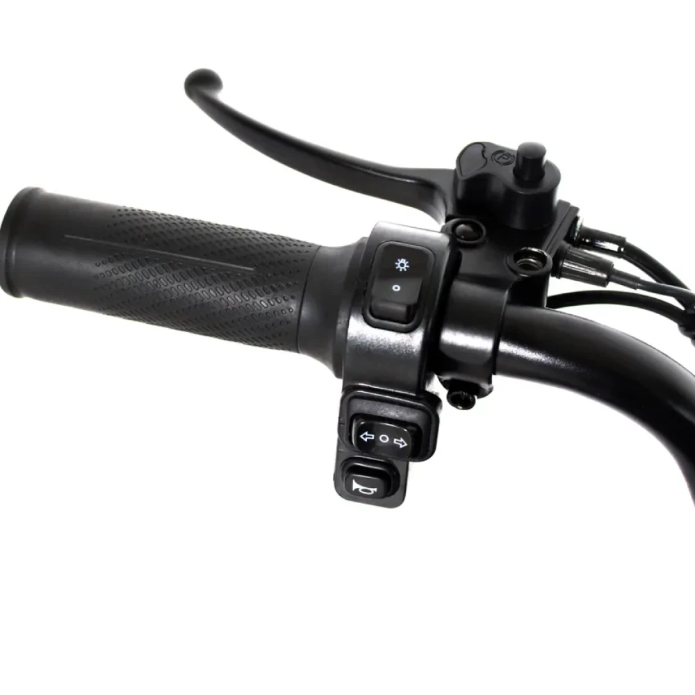 Электроскутер также оснащен мощным освещением, включая яркий передний фонарь и задние стоп-огни, а также повторители поворотников, что значительно повышает видимость в темное время суток. Ручка газа мотоциклетного типа позволяет легко и точно управлять скоростью, добавляя удобства в процессе вождения.