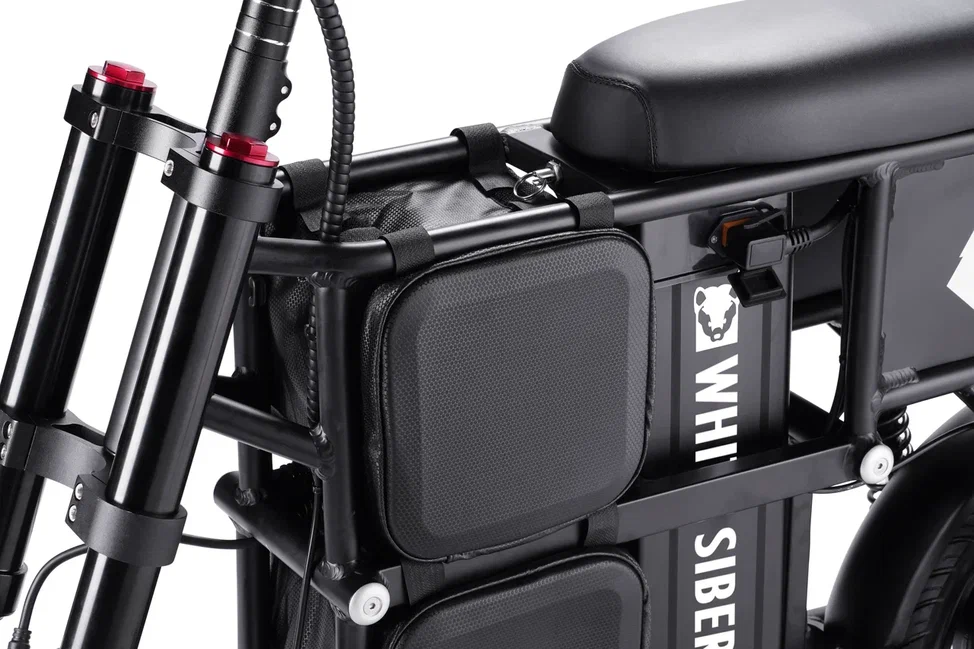 WHITE SIBERIA ZVER удобно хранить и транспортировать благодаря регулируемому рулю и складывающимся подножкам. Это позволяет легко помещать электроскутер в багажник автомобиля или в общественный транспорт. Его можно без проблем перевозить в грузовых лифтах, а удобная ручка за сиденьем делает перенос простым даже через трудные участки.