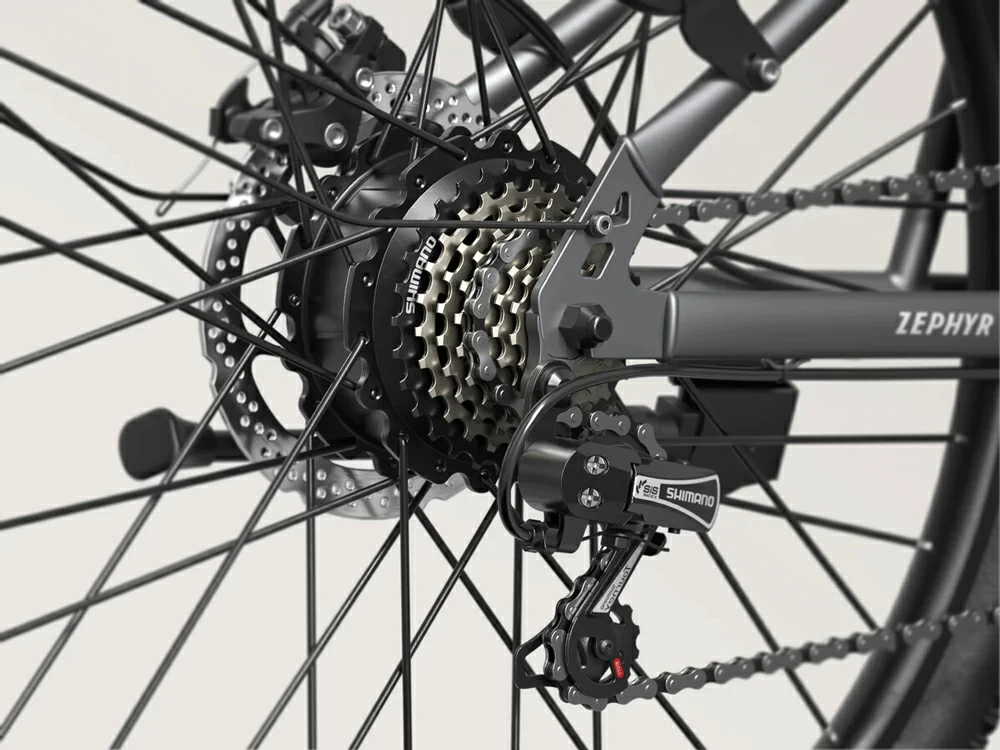 Семиступенчатая трансмиссия SHIMANO позволяет адаптировать передаточное отношение под различные условия движения. Механическая трансмиссия работает независимо от электропривода, что дает возможность использовать велосипед в обычном режиме при разряженной батарее или для получения физической нагрузки. Переключение передач осуществляется манетками на руле, обеспечивая четкое и надежное срабатывание.