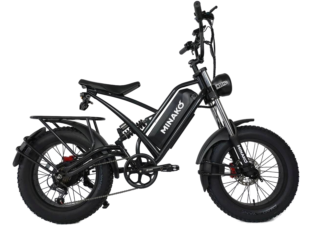 Широкие колеса и качественные шины обеспечивают отличное сцепление и устойчивость на различных покрытиях, что делает Minako FOX универсальным для городских и загородных поездок. Этот электрофэтбайк – отличный выбор для тех, кто ценит стиль, комфорт и производительность